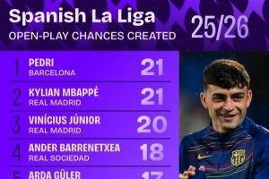 西甲本赛季运动战创造机会榜:佩德里、姆巴佩21次并列第一