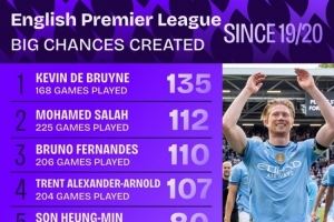 - 19-20赛季以来英超创造重大机会榜:德布劳内、萨拉赫、B费前三